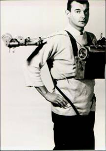 Tom Moore, Herman Beduerftig, and Werner Voss flew the tethered rig (see pictures of the set test above). The hand controls were operable and did allow some degree of control, while flights were initially powered by compressed air and then nitrogen, eventually Hydrogen peroxide was used as the final and proper fuel propellant. The source gas supply and H2O2 were all stationed on the ground in a pit area on the arsenal. The military refused to extend Tom’s funding for developing a self-contained system, even though he had the full support of Dr. von Braun. The Jetvest was considered a “far-out” device or even laughable by some in the military and when the military later decided to investigate a “battlefield mobility device”, the they invited contractors, but “they didn’t invite us” as Tom later stated.